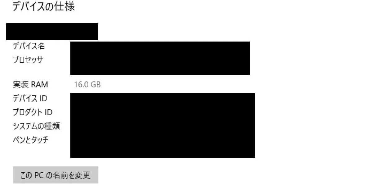 デバイスの仕様の下にある「実装RAM」がこのPCで使用可能なメモリ容量となります。(下記の写真では、16GBメモリ容量があるということになります。)
